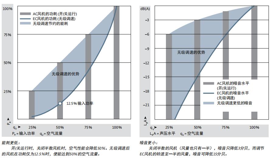 下圖直觀地比較了開/關(guān)運(yùn)行與無極調(diào)速時,潛在的節(jié)能和降噪的情況: