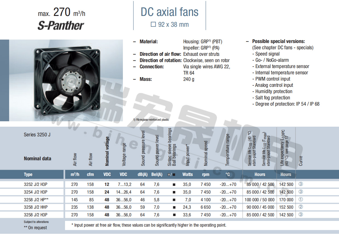 3252J/2H3P風量:270m³/h 電壓:12v 噪音:64Db 功率:35W 轉速:7450r/min