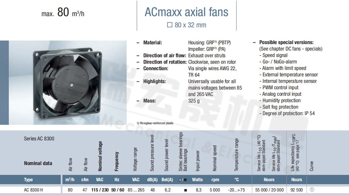 Aci4420HH風(fēng)量:175m³/h 電壓:230v 電流:5.3A 功率:4.6W 轉(zhuǎn)速:3300r/min