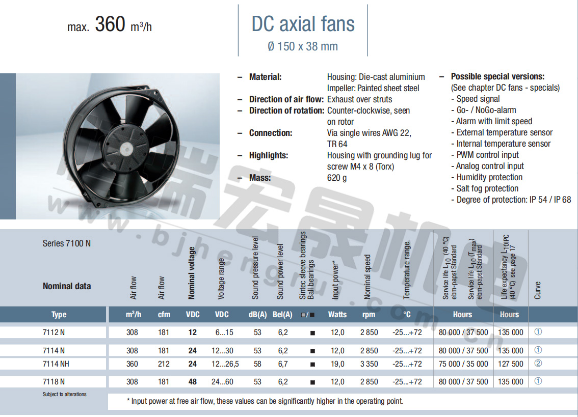 7114NH風(fēng)量:360m³/h 電壓:24v 噪音:58Db 功率:19W 轉(zhuǎn)速:3350r/min
