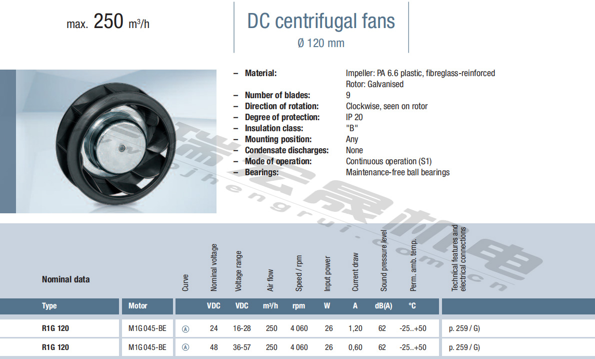 R1G 120 等多種類型風(fēng)機(jī)有售G1G085-AB05-01風(fēng)量:95m³/h 電壓:24v 電流:0.64A 功率:14W 轉(zhuǎn)速:2850r/min